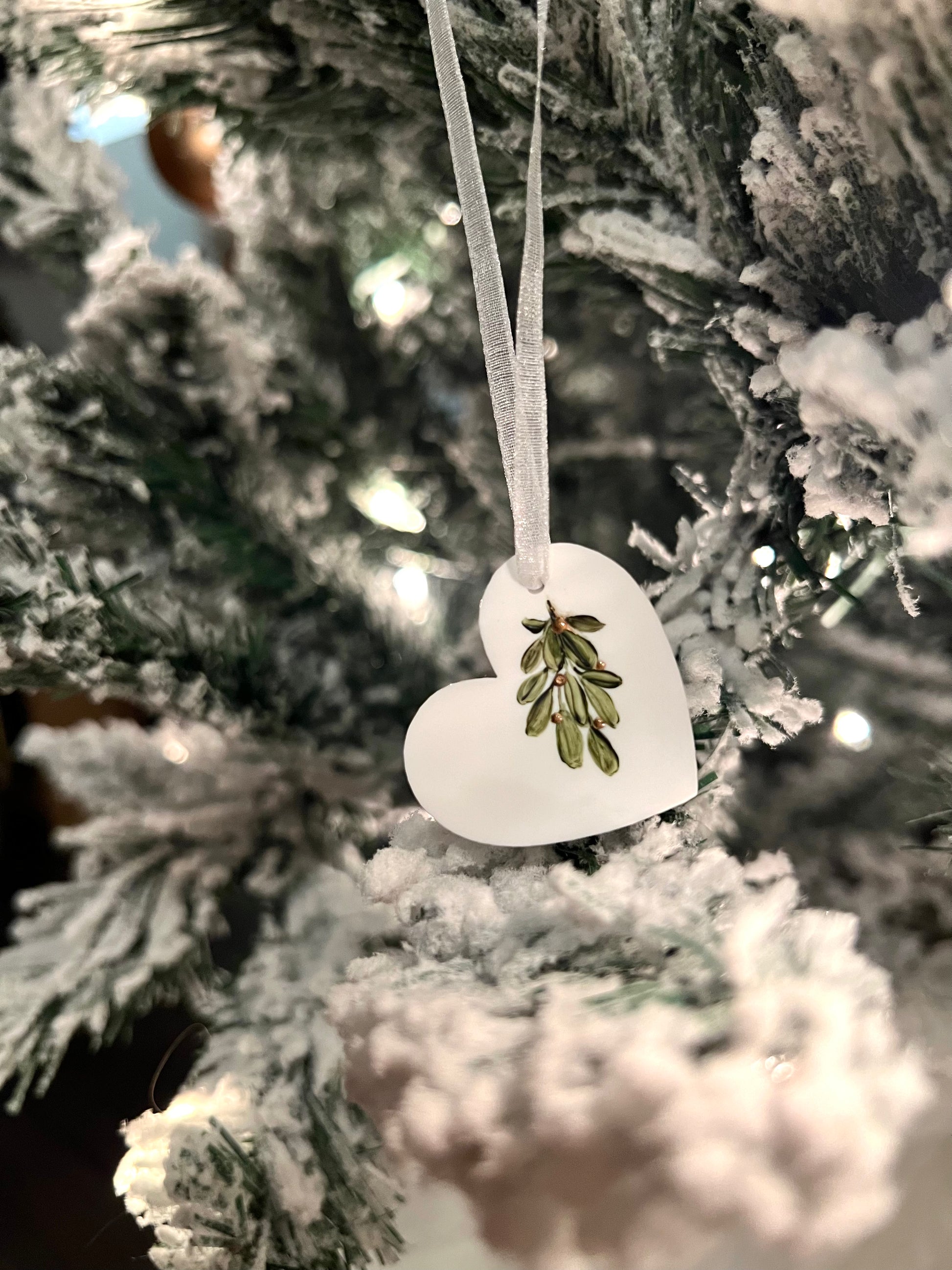 ~A white acrylic heart shape, hand painted mistletoe, finished off with gold details and a white ribbon