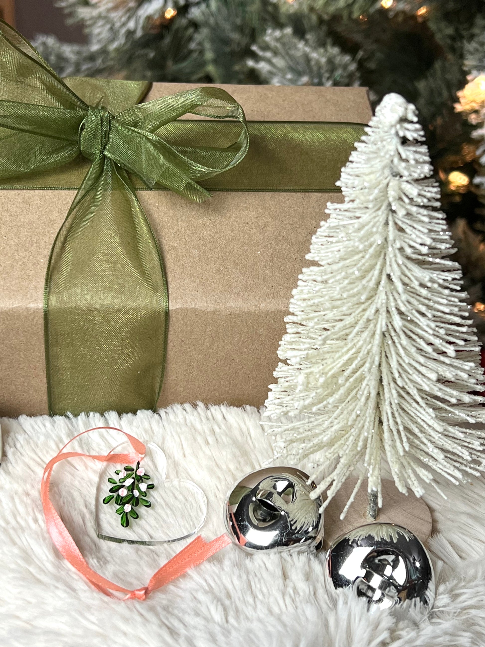 ~A clear acrylic heart shape, hand painted mistletoe, finished off with a pale pink ribbon